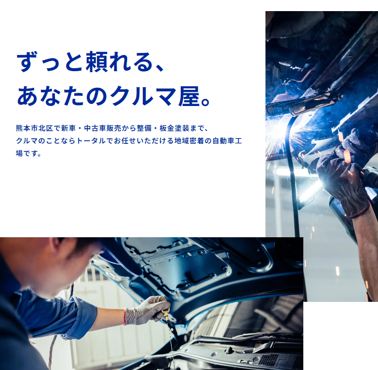 熊本市北区で新車・中古車販売から整備・板金塗装まで、クルマのことならトータルでお任せいただける地域密着の自動車工場です。
